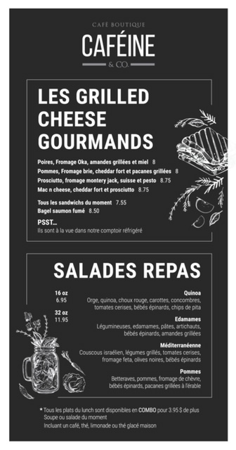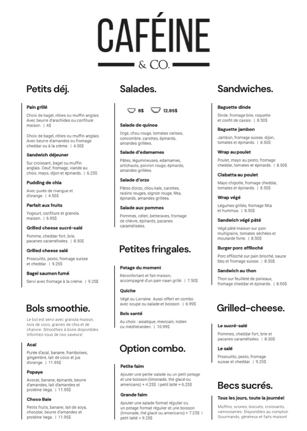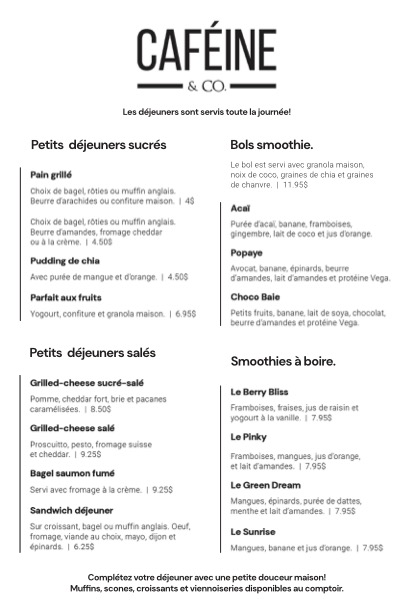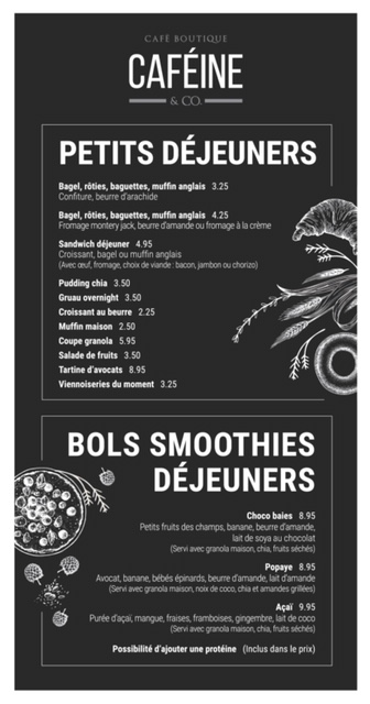 Caféine & Co’s menu offers a refreshing balance of health-conscious choices and comforting café classics, making it a versatile stop for both quick bites and leisurely visits. The standout Bol Smoothie perfectly embodies the restaurant’s emphasis on fresh, vibrant ingredients, delivering both flavor and nutritional value in a visually appealing presentation. Alongside this, the menu showcases an array of carefully crafted sandwiches, salads, and baked goods, each thoughtfully prepared to complement the café’s cozy atmosphere. Whether indulging in a hearty breakfast item or enjoying a light snack with a perfectly brewed coffee, the menu demonstrates a consistent attention to quality and detail. With clear pricing and a diverse selection that caters to different tastes, Caféine & Co ensures every visit is satisfying, leaving a lasting impression of freshness, flavor, and approachable sophistication.